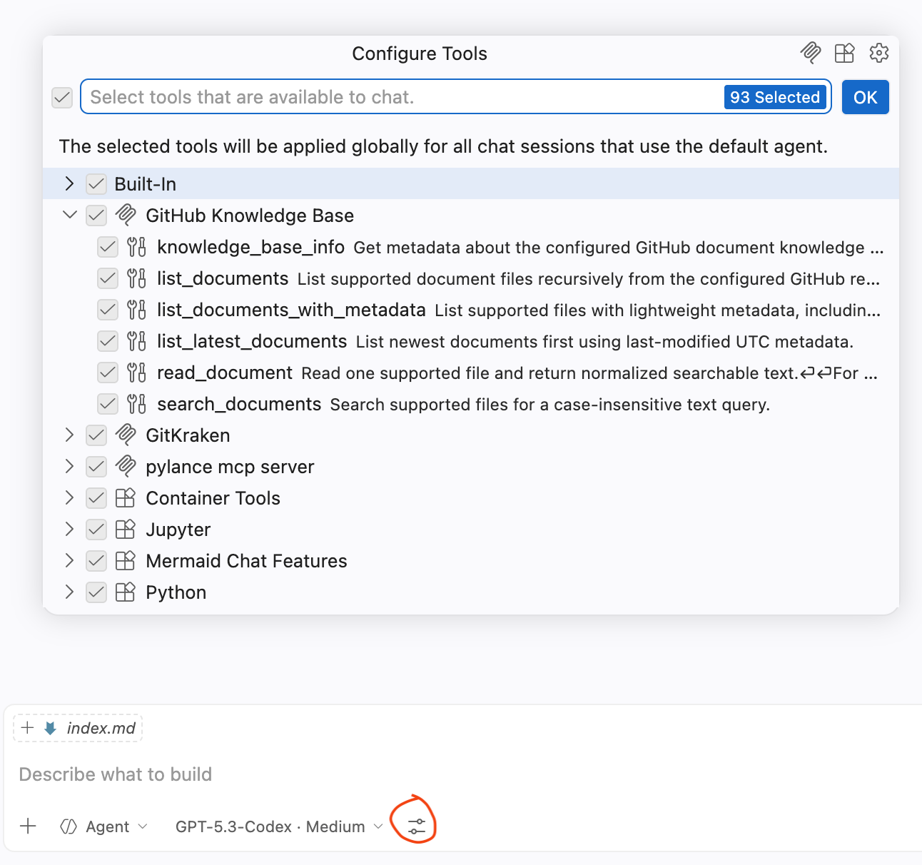 }To verify that the MCP server was configured correctly and is picked up by Copilot, click the “Configure Tools…” button in the Copilot chat. It should show a list of available MCP servers, hopefully including the newly added “GitHub Knowledge Base” with its tools: