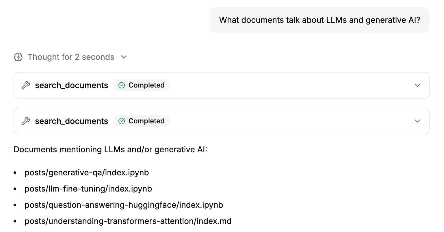 As an example for a more useful, yet still quite simple MCP server, I built a GitHub Knowledge Base MCP. The idea behind it is to turn any public GitHub repository into a remote knowledge base by providing tools that can search and read the repo’s markdown and notebook documents. My goal is to demnostrate the MCP based on my blog repo, which contains all blog posts as documents. With the MCP, an AI assistant can then quickly search available posts or retrieve the latest post.